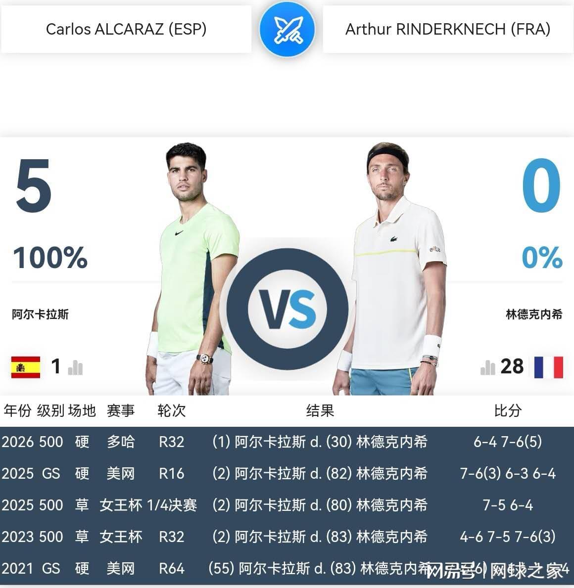 生于2003年的阿尔卡拉斯和生于1995年的林德克内希,职业生涯至今交锋五次,阿尔卡拉斯五战全胜,其中最近三战一盘未失、零封对手。特别令人瞩目的是,自2021年美网至2026年ATP500多哈站,阿尔卡拉斯五次与林德克内希交锋,在五次战胜对手之后,都取得了非常好的战绩。首次交锋的2021年美网,阿尔卡拉斯最后首次闯进大满贯八强,与加拿大酷小黑阿利亚西姆同时成为最先闯进大满贯八强的00后选手。其后的四次交锋,阿尔卡拉斯最后都夺取了冠军。因此,林德克内希,真是阿尔卡拉斯的福星。